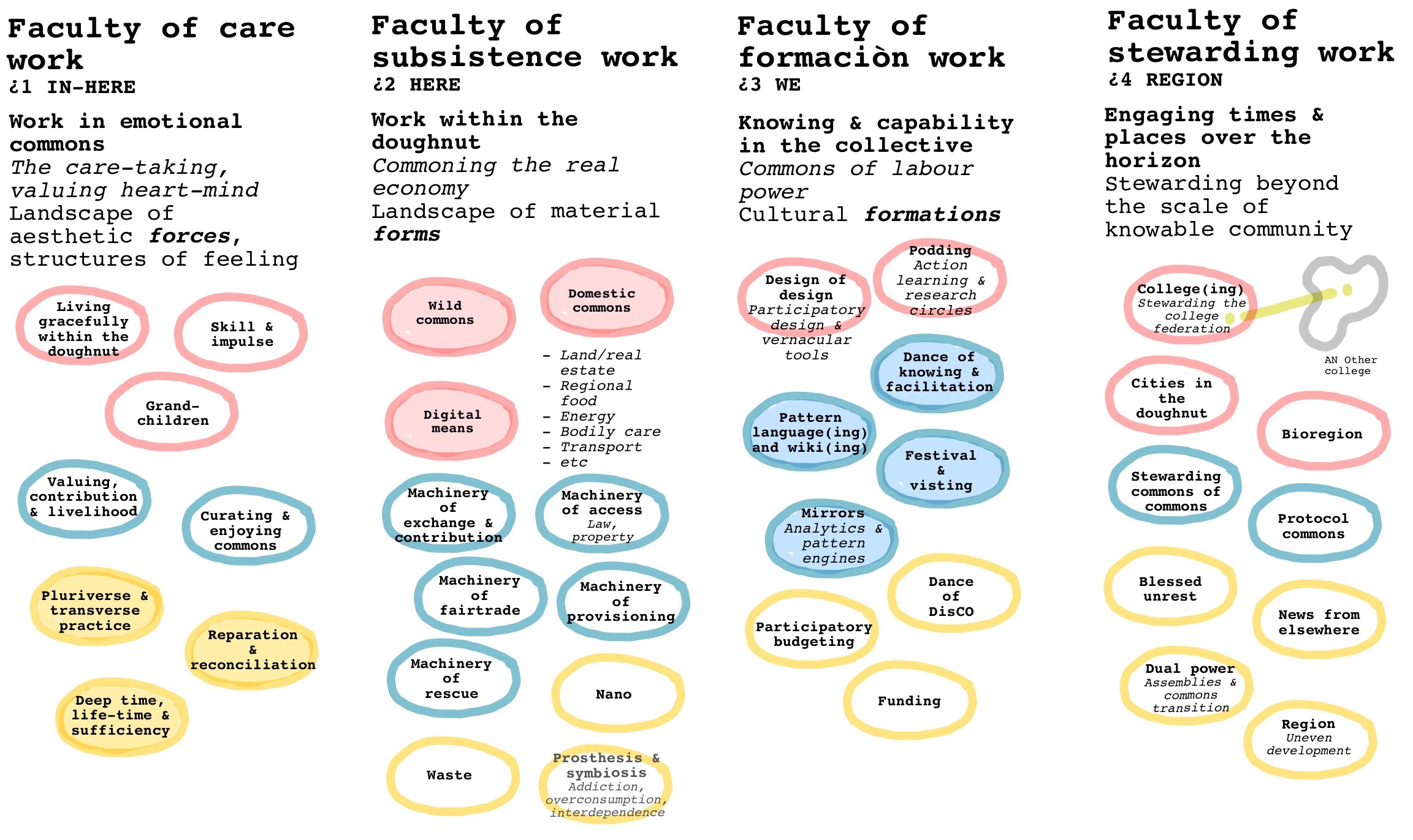 The landscapes are taken as the weft, and the zones as the warp, in a 'weave' of pattern-space. Within each intersection of warp/weft, there can be any number of families of related patterns. In the context of organising a 'college' of patterning, the zones are faculties, and the pattern families are schools. Schools constitute the third system of categories in foprop. There are something like 40 of them.