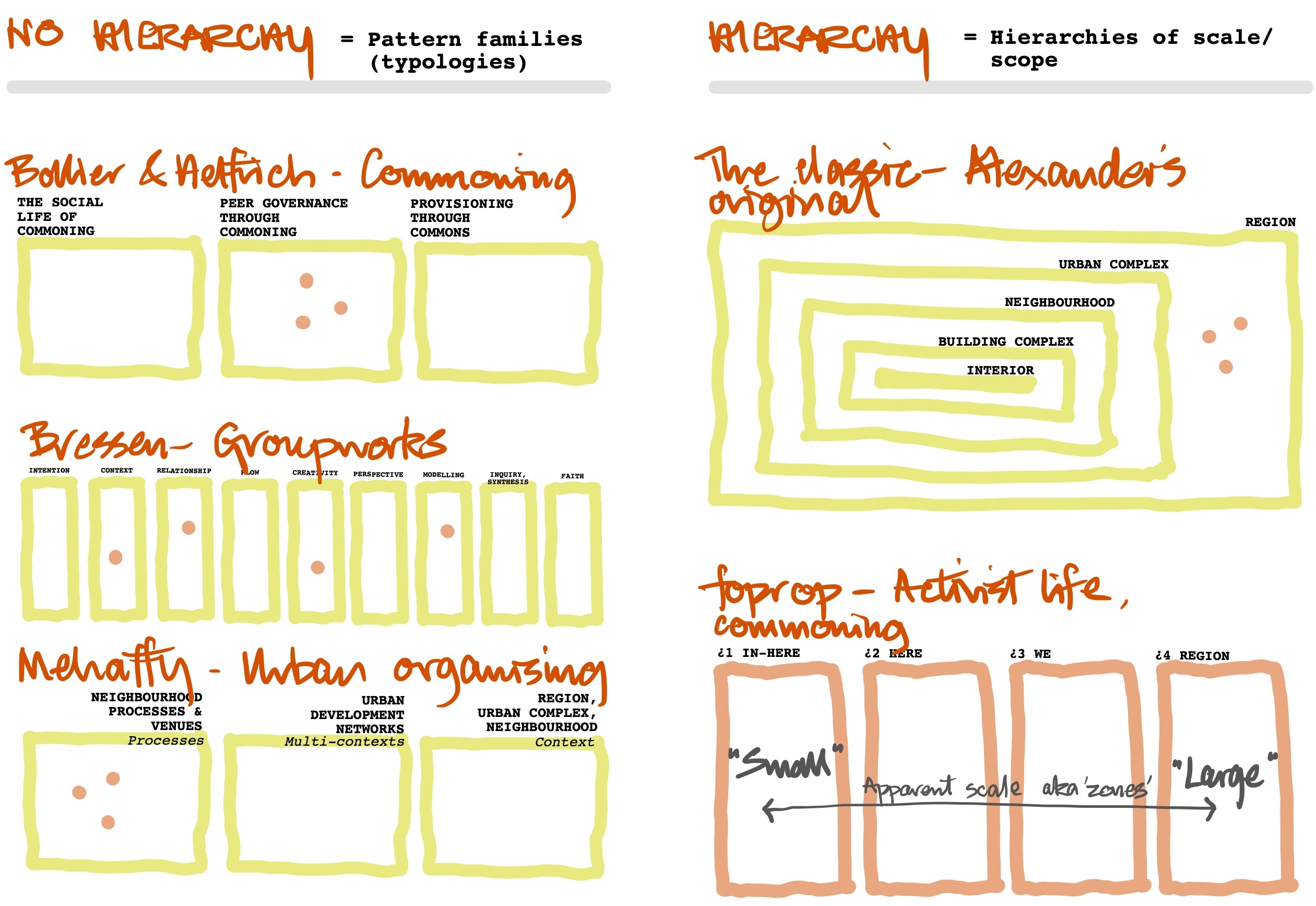 Some of these category structures are not hierarchical - basically, typologies. Of the ones shown, only Bollier and Helfrich's pattern language of commoning has a set of categories that seem intrinsic to the nature of the domain: they regard commoning as essentially comprising the three designated modes of practice, in a 'dance' of commoning. The Groupworks categories on the other hand - by the admission of the language developers themselves - were a partly-failed attempt to put some domain structure on an aggregation of free-standing practices 'scraped' from a diverse community.