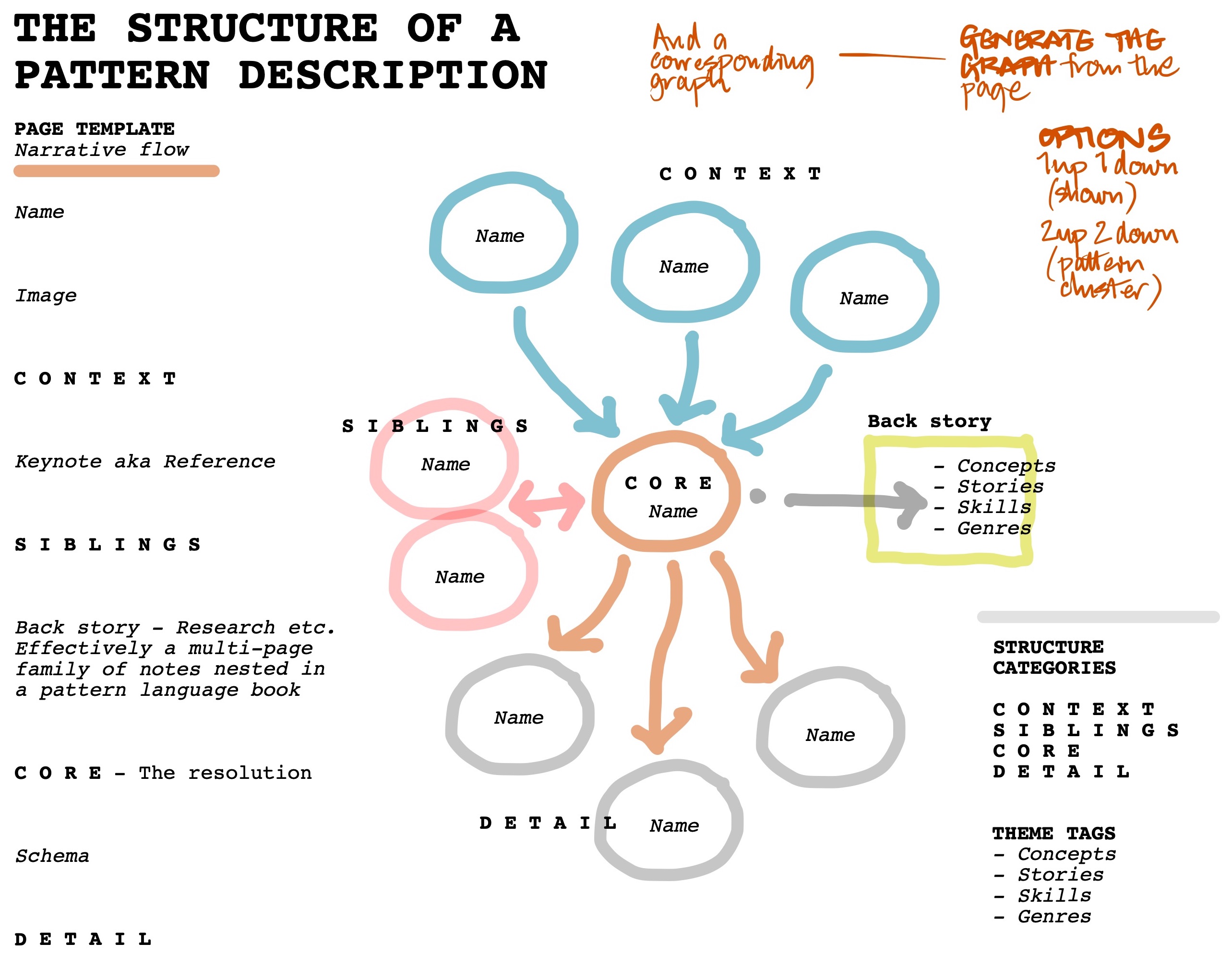 - Context - the patterns that this pattern helps to complete; the elements of a situation in which the pattern becomes needed - Keynote - A summary paragraph, equivalent to the 'reference' of a wiki page. This outlines the challenge, tension or contradiction to which the pattern is a practical response - Siblings - Actually, not in Alexander. These are patterns that resonate with or affiliate with the present pattern, without being (hierarchical) context. Peers, not details, not parents